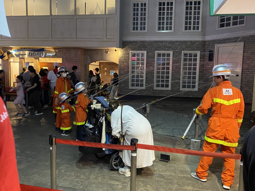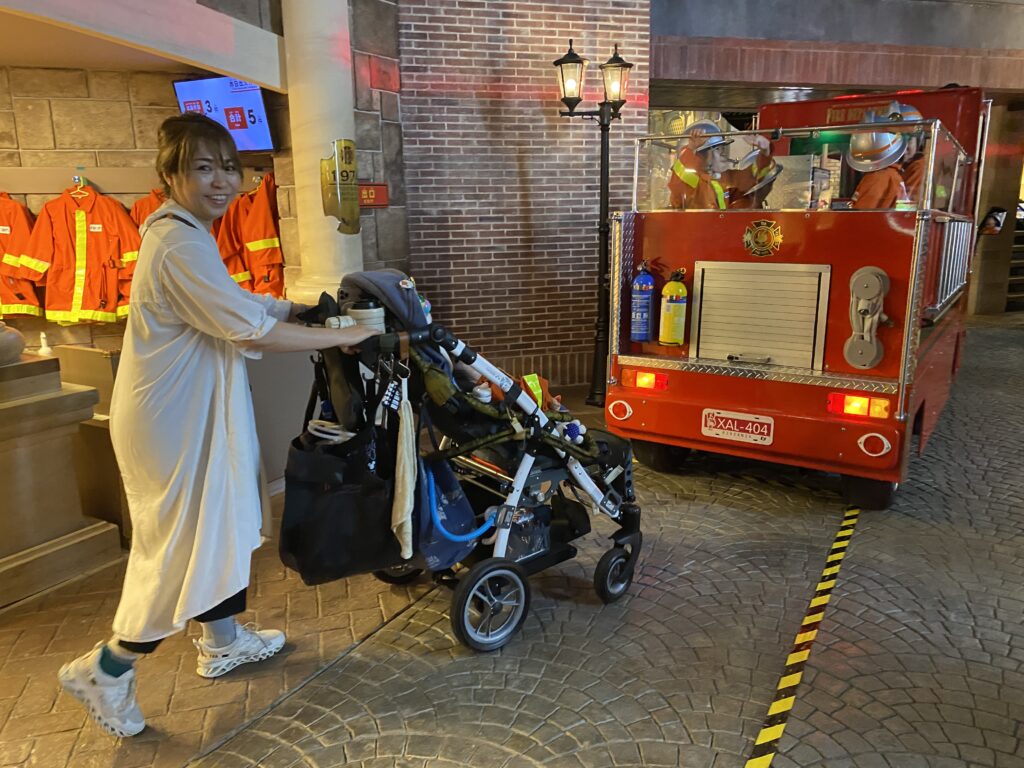 消防車に大人が乗ることはできない(抱っこもNG)ようで、バギーで消防車の後を追いかけます。