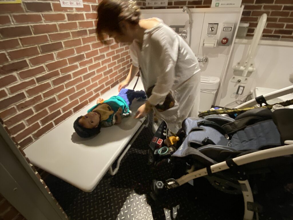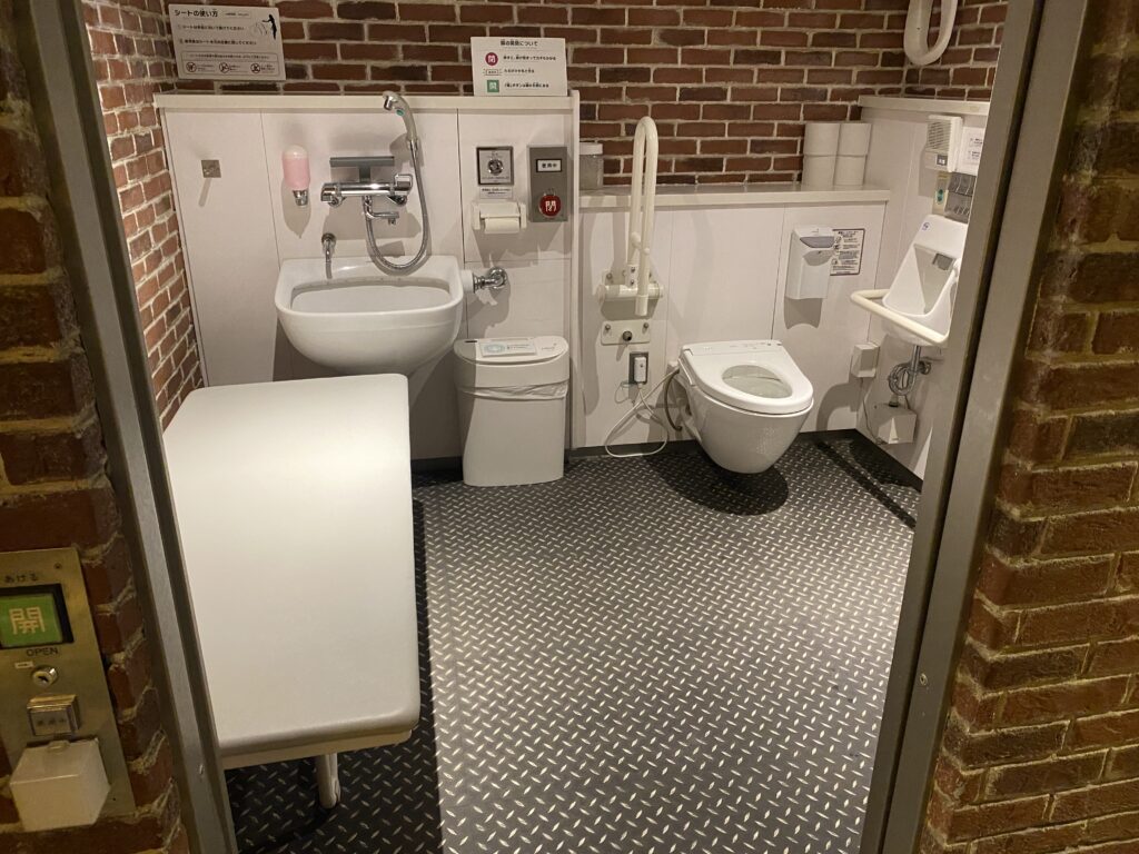 バギーも入れる広いスペースの多目的トイレに、ユニバーサルシートも設置されています。