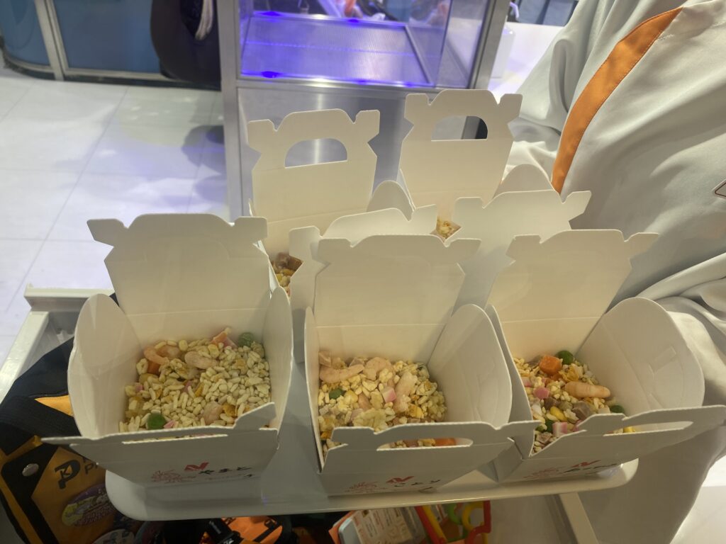 冷凍ピラフをつくるために、好きな具材を入れて、特殊な冷凍技術を用いて袋を振り振り。