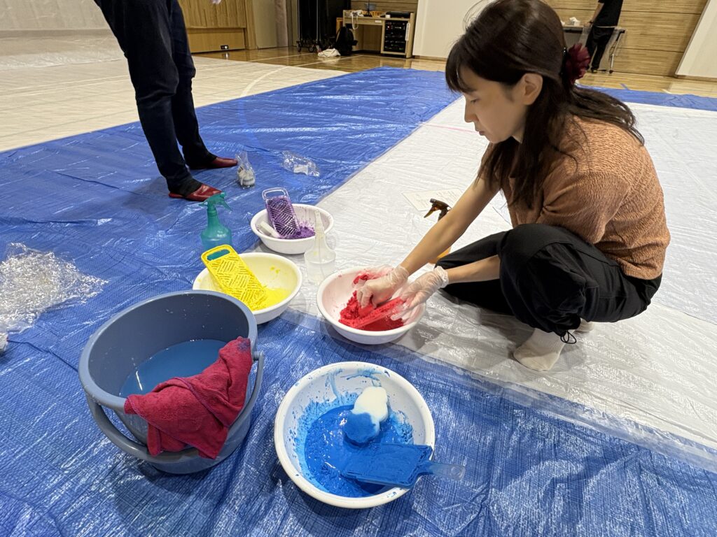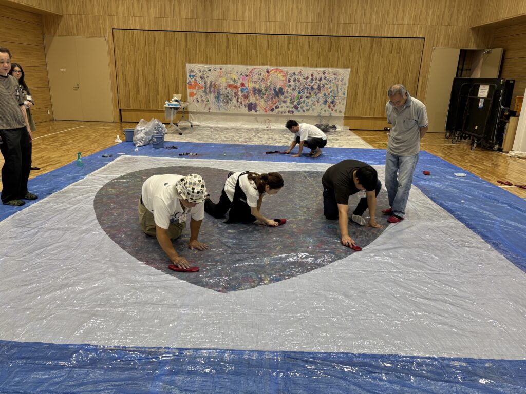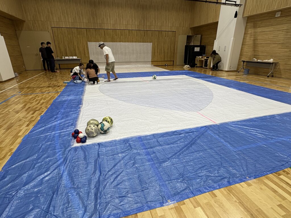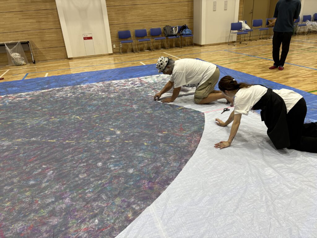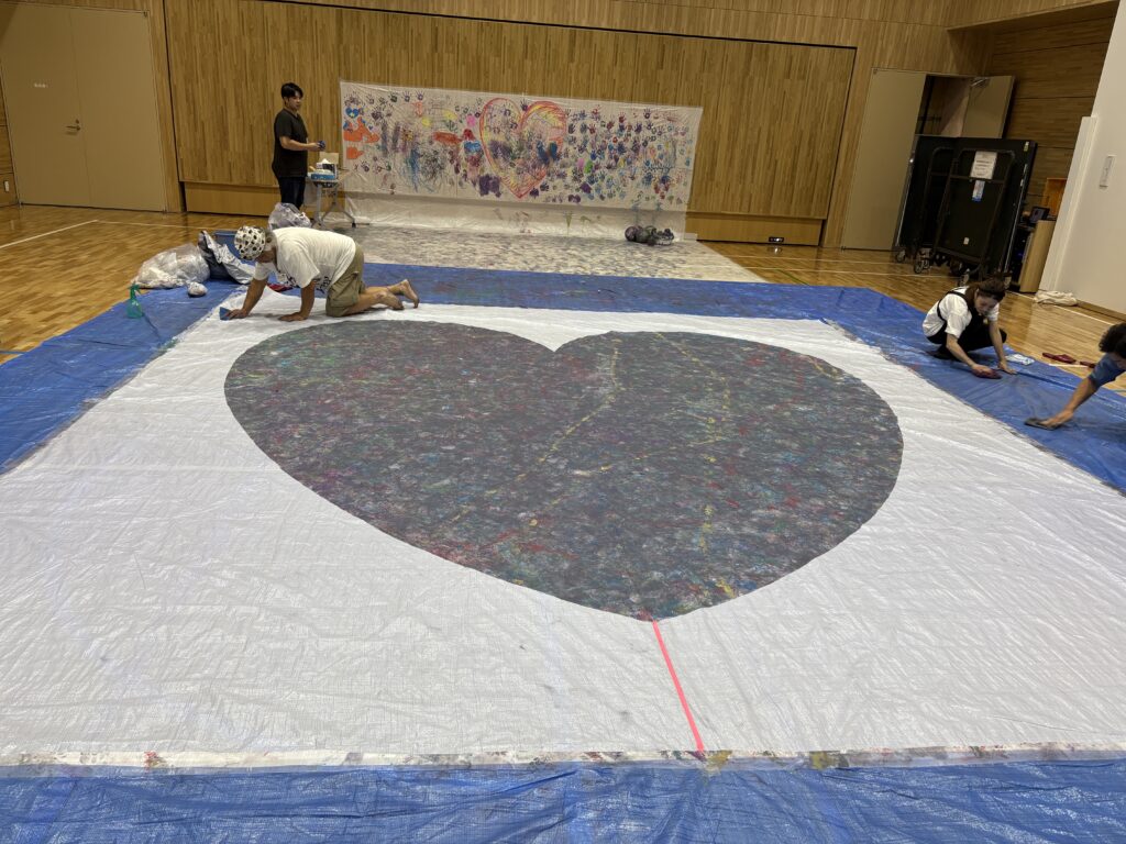 会場が汚れないようにブルーシートを敷き、今回の作品となるハートの台紙を養生テープで固定。