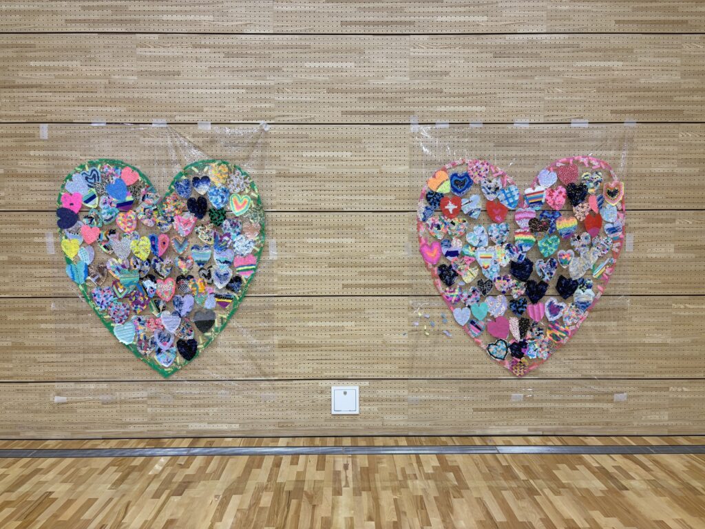 子どもたちがマスキングテープで作ったハートが集まって、大きな2つのハートになりました。