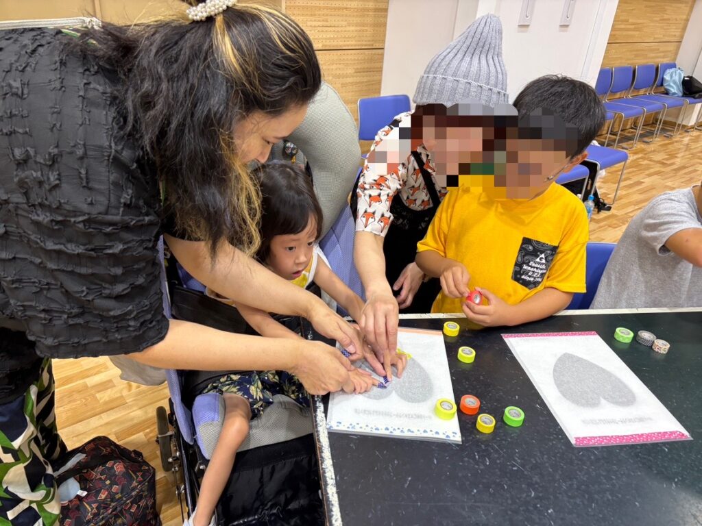 そして、マスキングテープでハートをつくるコーナーでは、近くに座っていた親子が、作り方を教えてくれました。