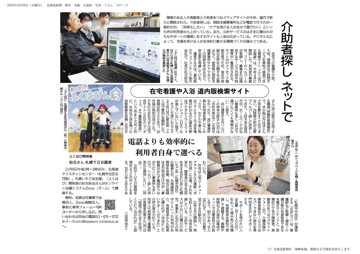 2025年10月30日の北海道新聞朝刊に、「さぽんて」の記事を掲載していただきました。