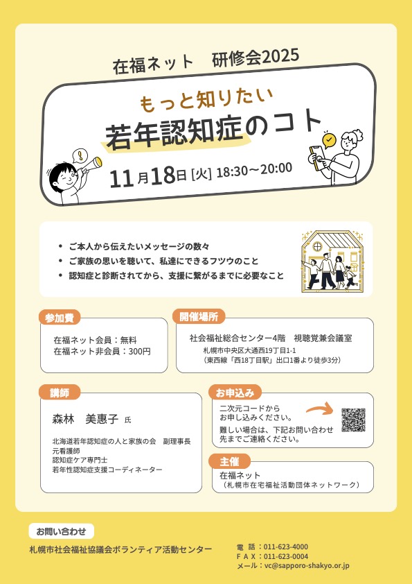 NPO法人あえりあも加入している在福ネット(札幌市在宅福祉活動団体ネットワーク)が主催する研修会のお知らせです。