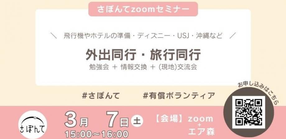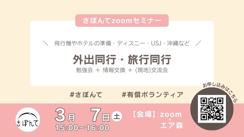その前に、介助が必要な方の外出同行・旅行同行について、情報共有の「さぽんてzoomセミナー」を行います。