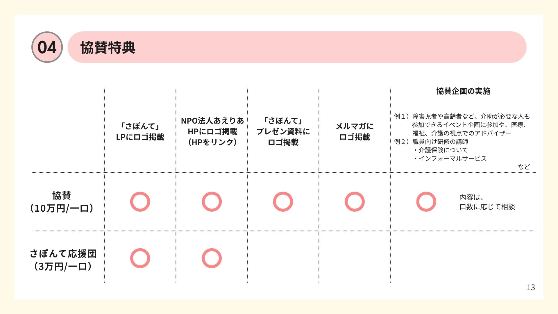 『さぽんて』利用料を極力少なく設定し、協賛金・寄付金・助成金などにて運営していきたいと考えております。
